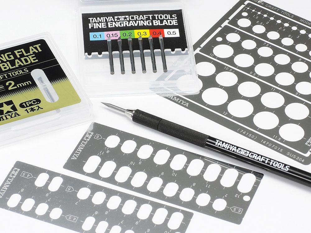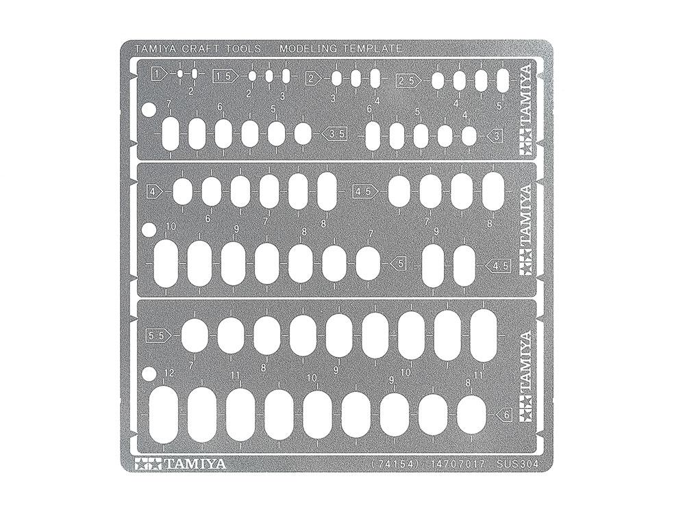 Cuenta con sesenta tamaños diferentes, desde 1 mm x 1,5 mm (el más pequeño) hasta 6 mm x 12 mm (el más grande). Fabricada en acero inoxidable de 0,1 mm de espesor, la plantilla se puede doblar para ajustarse al detallar superficies curvas.