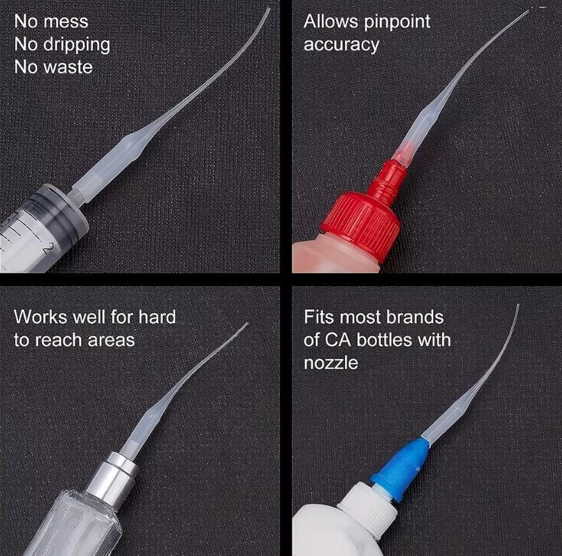 Set de 12 puntas de precisión permiten dosificar el pegamento de cianocrilato en cantidades controladas protegiendo la boquilla original del bote.