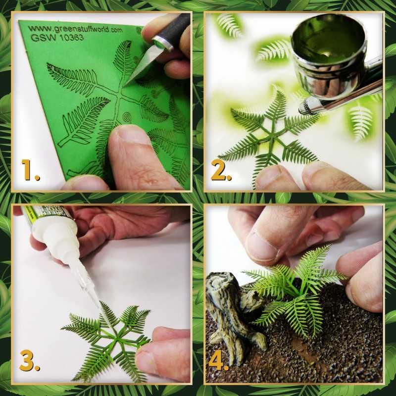 Separe cuidadosamente del soporte. Se recomienda utilizar aerógrafo para pintarlas aunque también se puede usar pincel con cuidado. Evite usar demasiada pintura para no humedecer excesivamente el material. Dejar secar completamente antes de montar. El montaje se puede realizar mediante cola PVA o cualquier tipo de pegamento, pero se recomienda especialmente utilizar pegamento de cianoacrilato. Usar barniz después de pintar agrega resistencia a las plantas.