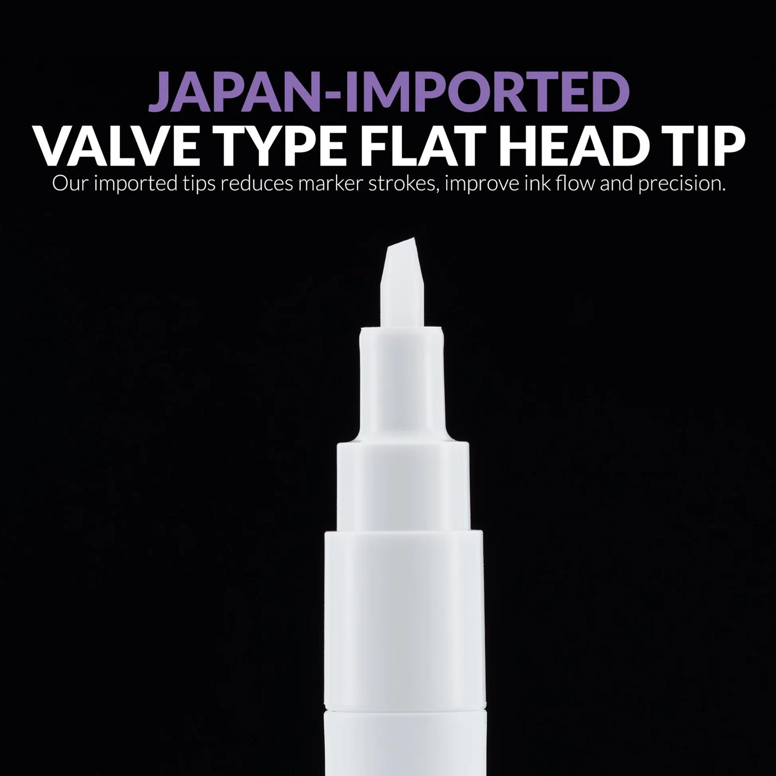 Punta de cabeza plana tipo válvula importada de Japón: Equipados con puntas de cabeza plana tipo válvula importadas, estos marcadores garantizan un flujo de tinta suave, reducen los trazos del marcador y evitan que se acumulen fibras de esponja, lo que le brinda un acabado de calidad profesional en todo momento.