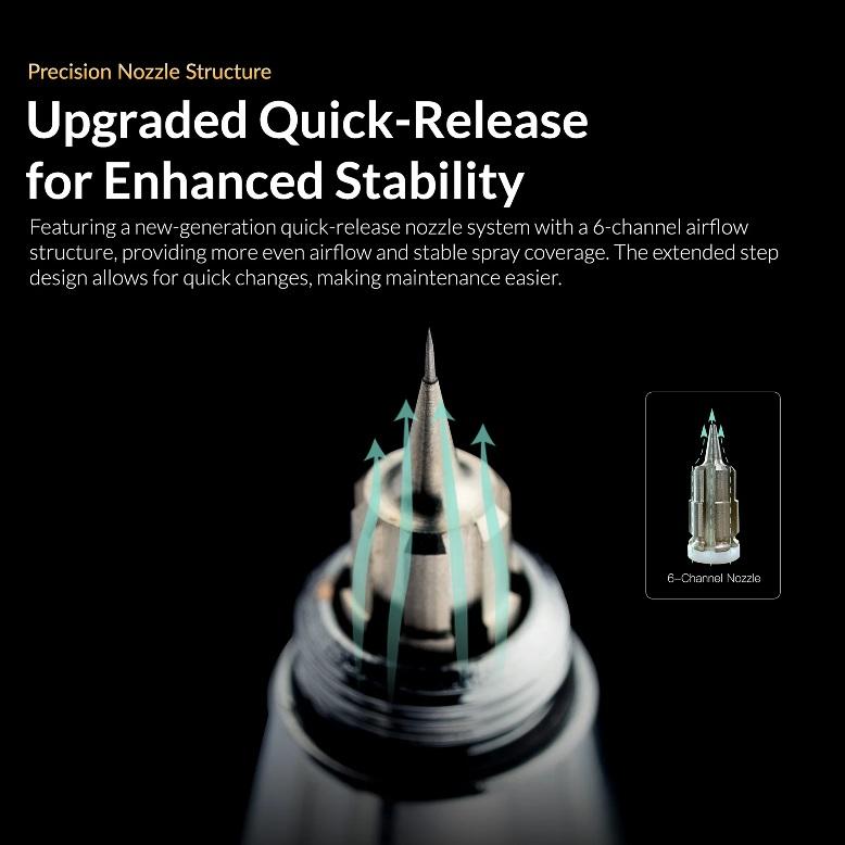 Incorpora un sistema de boquilla de liberación rápida de nueva generación con una estructura de flujo de aire de 6 canales, que proporciona un flujo de aire más uniforme y una cobertura de pulverización estable. El diseño de escalón extendido permite cambios rápidos, facilitando el mantenimiento.
